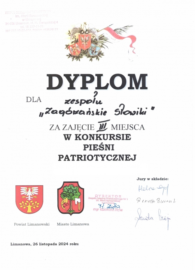 Komisja konkursowa doceniła profesjonalizm i emocjonalne podejście naszego zespołu, przyznając mu III miejsce – informuje opiekunka grupy. To wyróżnienie jest dla nas powodem do dumy i świadectwem wysokiego poziomu artystycznego oraz zaangażowania uczniów w promowanie wartości patriotycznych. Udział w konkursie pozwolił naszym uczniom nie tylko zaprezentować swoje umiejętności, ale także pogłębić wiedzę o polskiej kulturze i historii. Gratulujemy im sukcesu i życzymy dalszych osiągnięć w rozwijaniu talentów muzycznych!