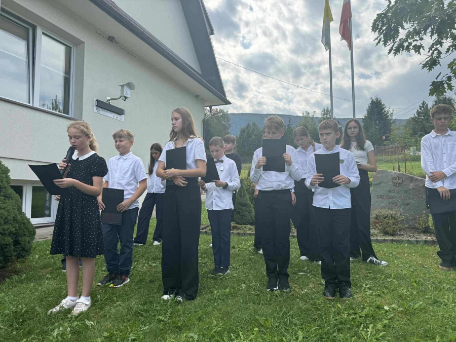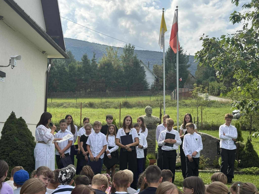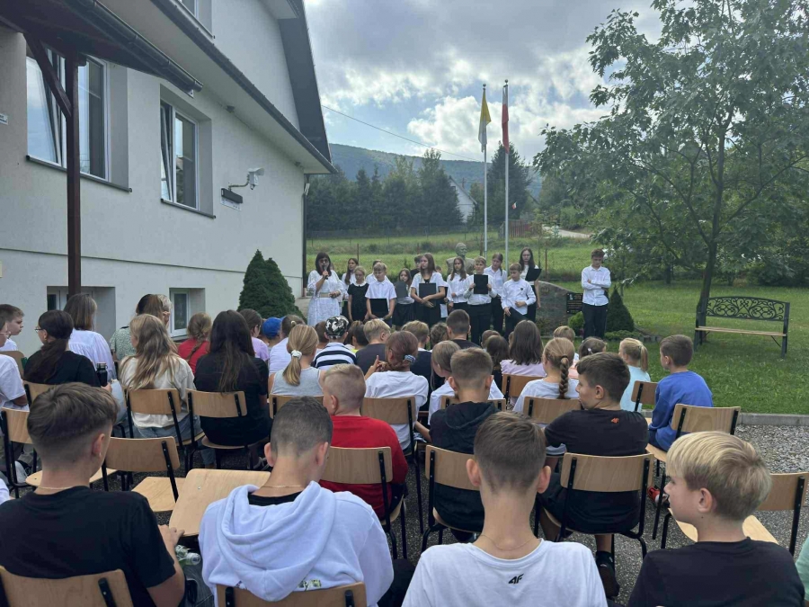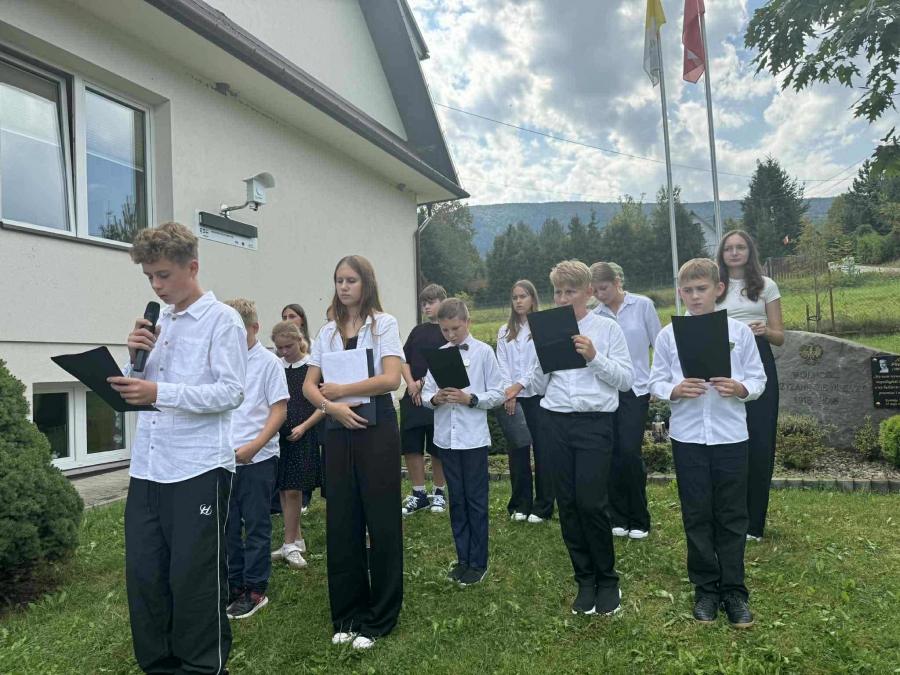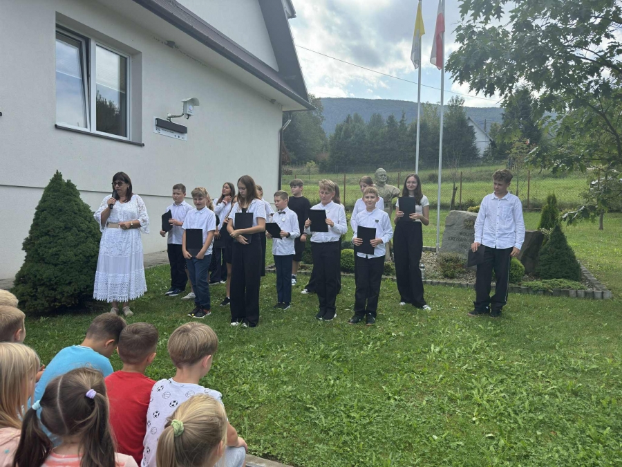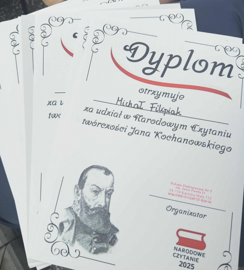 Tym razem jej bohaterem był Jan Kochanowski. W piątek 6.09.2025 r., korzystając z pięknej pogody, zgromadzili się na placu przed budynkiem szkoły, aby posłuchać wybranych utworów Mistrza z Czarnolasu, które czytali uczniowie klasy V, VI i VIII. Po wysłuchaniu każdego wiersza narratorzy w zwięzły, prosty sposób tłumaczyli jego treść i wyjaśniali przesłanie, zachęcając do odkrywania na nowo fraszek, pieśni i trenów. Podczas prezentacji zwrócono uwagę na uniwersalne, ponadczasowe wartości, które wypływają z twórczości naszego wielkiego poety. Na pamiątkę udziału w Narodowym Czytaniu 2025 uczniowie otrzymali dyplomy, które wręczyła Pani Dyrektor Barbara Tokarz.